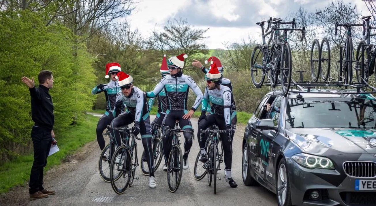 Team One Pro went on a training ride in their Christmas hats.