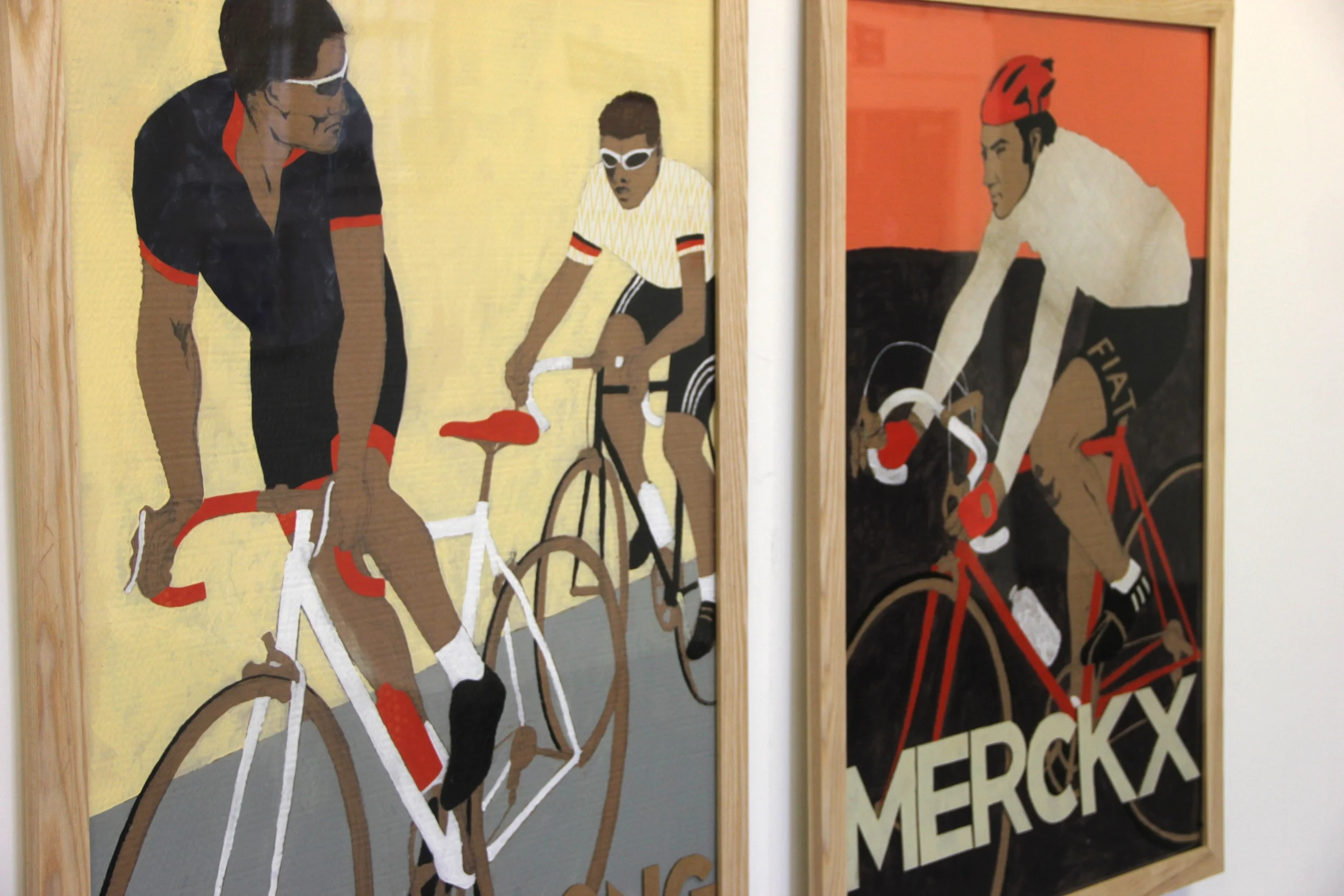 Ride Velo favourite, artist Eliza Southwood, was displaying a new series of mixed media works that were commissioned by Spin London to fill the entrance space. Featuring cycling legends such as Hinault, Armstrong, Burton and Pantani, all eight pictures were snapped up by a collector before the show even began! Luckily Eliza had brought along some other prints to sell including her new A2 sized 'Spring Classics'. We couldn't afford the A0 prints on display at Look Mum No Hands! currently but the A2 version was a winner and we ordered two!