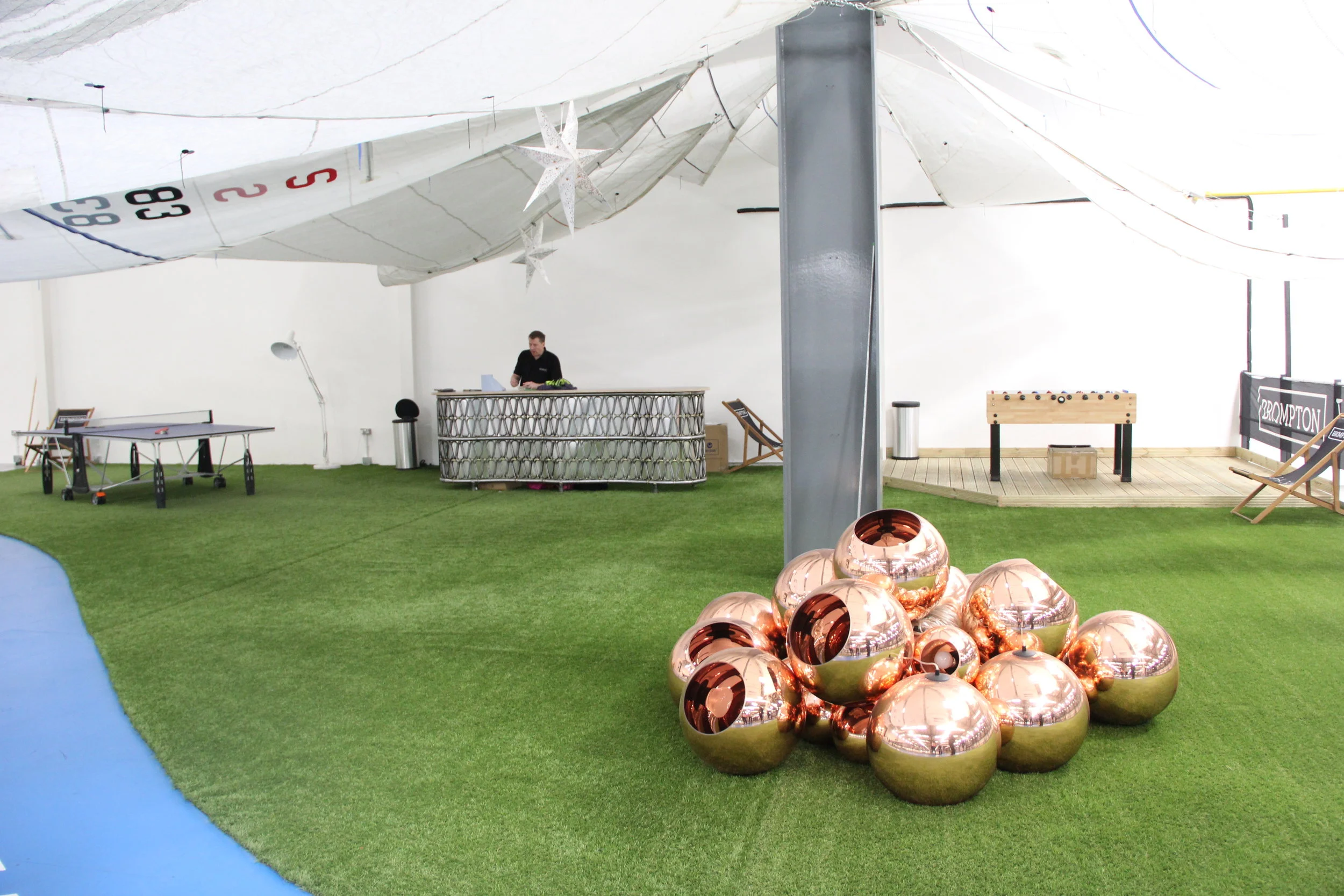 One would expect a factory like this to be noisy and dirty, but it is, in fact, a calm, reasonably quiet, airy and bright environment to work in. There is an upstairs relaxation area with a bar area, table tennis and table football, with deckchairs to relax in on breaks. It’d make a great space for a party.