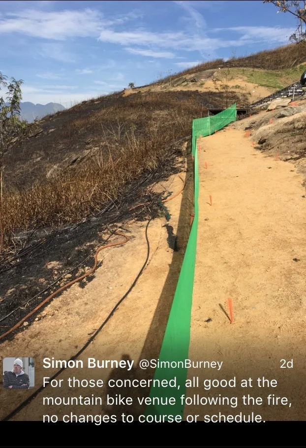 Sunday is the big day for the men's MTB championship, however, the three-mile course was damaged by wild fires earlier this week and organisers have been busily rebuilding sections before the weekend's racing begins.