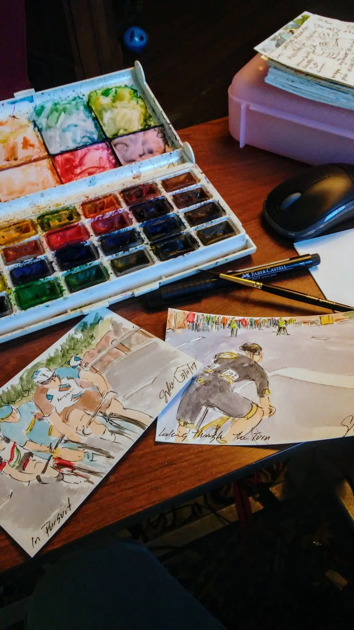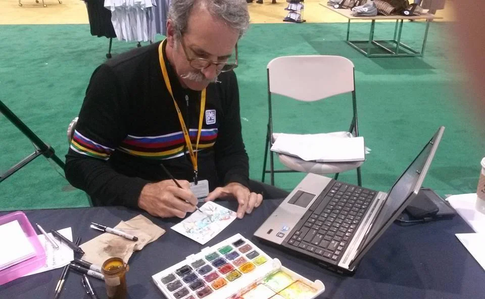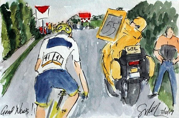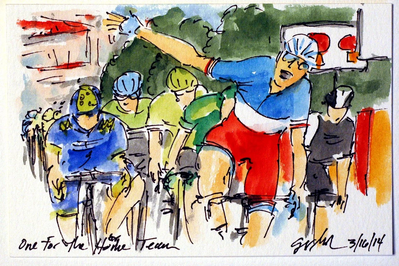 “All of the cycling work is created live without any knowledge of the results of the stage or the race. I will watch the race play out on video, and pause the broadcast when something catches my eye. I pick the imagery for the visual impact or to tell the story of the racing as it unfolds. I try to be as unbiased as possible, but just like anyone else I have my favourite riders and teams. So once I see what I want to paint, and have paused the image, I will first do an ink drawing of the image on the screen and then lay in the colors in a quick watercolor wash technique. Each painting has the race, stage, and the names of the riders (plus their teams) written on the back of the postcard sized painting.”