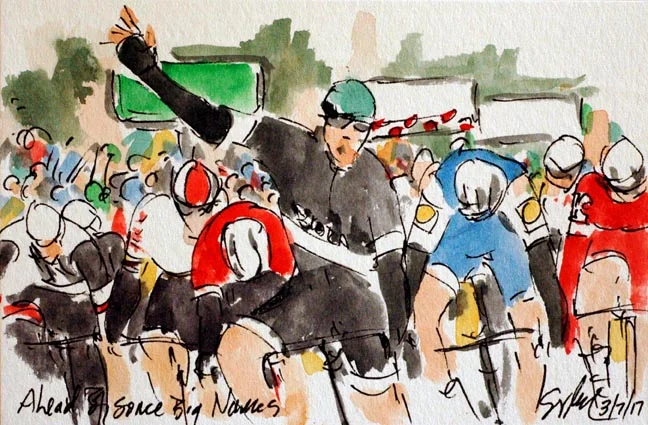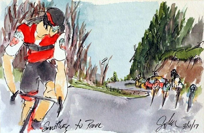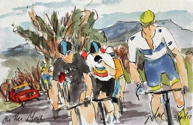 “Cycling affords me the chances to use what I love most about creating art, capturing the figure in motion and colour. Certainly the pro peloton is about both. I was an amateur racer way back in the 70s and have continued that passion for riding and racing (although I haven’t raced since 1979 - I still ride at near the same level I did when I was.) It’s a sport I know about, am passionate about, and is majestic in its imagery. The old adage to writers is to write what you know. I think the same applies to painting, and I am truly painting what I know.”