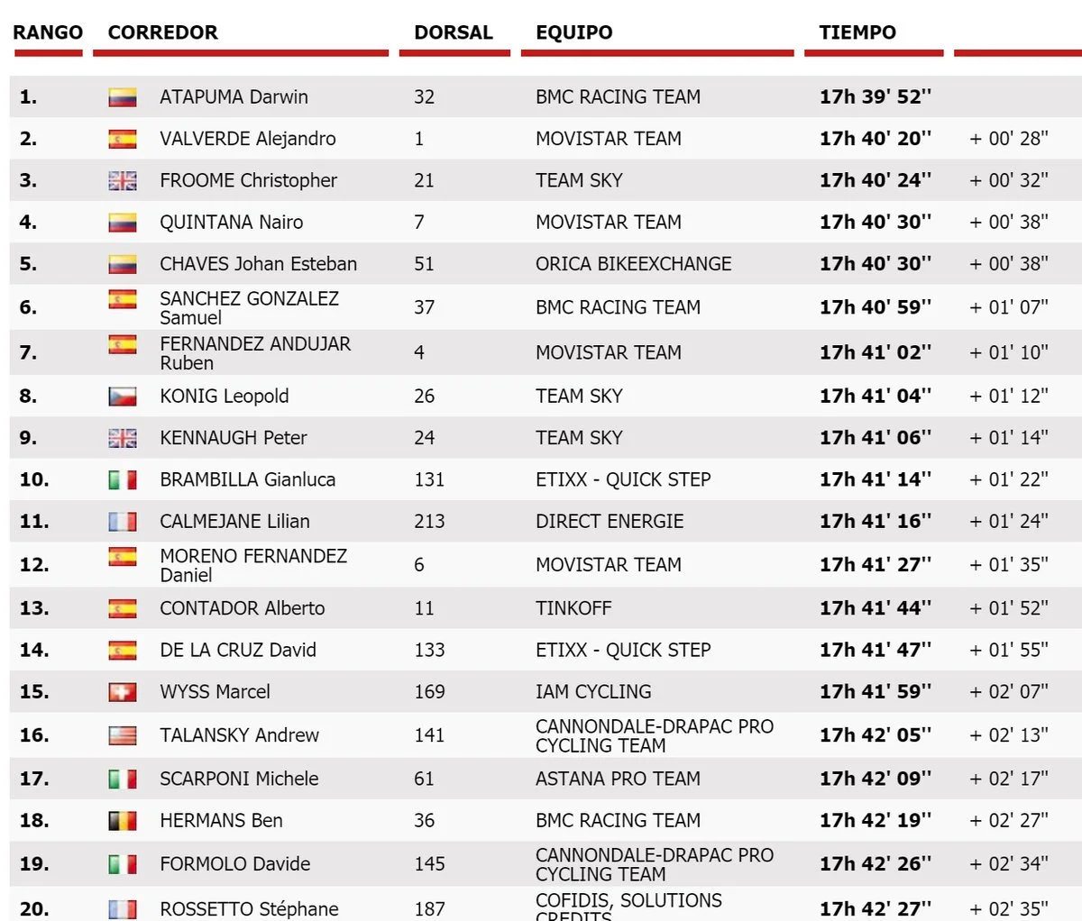 Belgium’s Gianni Meersman was lucky that he was on the other side of the road to the pole and went on to win the sprint finish. Darwin Atapuma, the race leader was caught up behind the crash and lost more than a minute but his time was reinstated under the 3km rule. He retains the red jersey, with Valverde in second, Froome four seconds behind him in third.